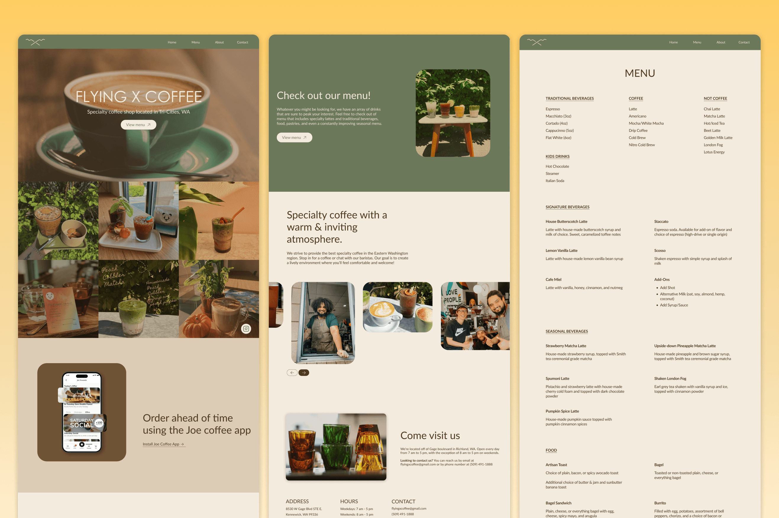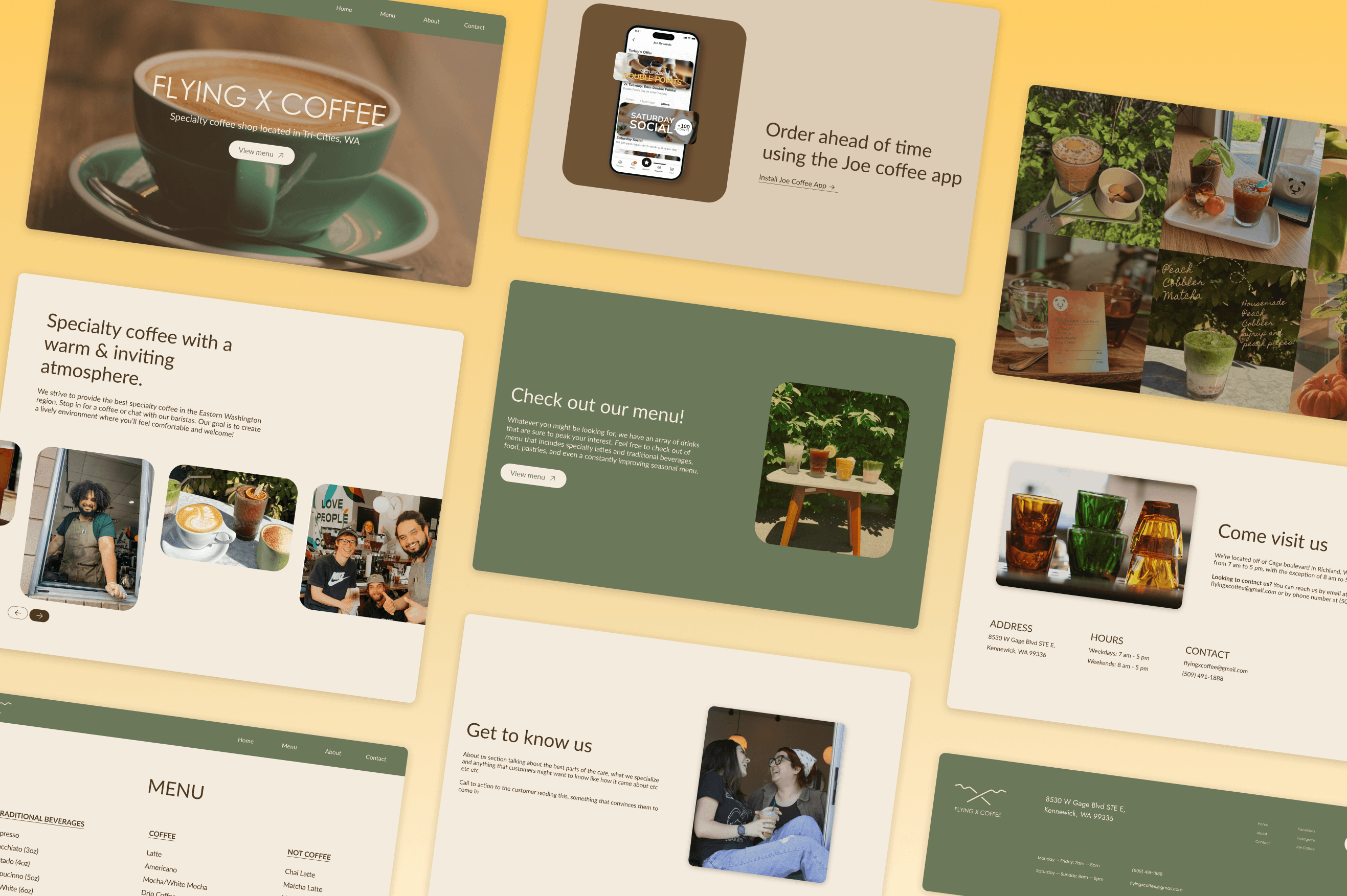 While I didn't conduct formal user research for this project, I relied heavily on conversations with Flying X's baristas and regular customers. Throughout the design process, I shared ideas, sketches, and prototypes with them and gathered their input and feedback. These conversations helped me better understand what visitors valued most about the shop. Additionally, this pointed out the information that users typically searched for online and what tone and visual style resonated with the brand the most. This ongoing dialogue ensured that the redesign reflected both the company's identity and the desires of it's community.